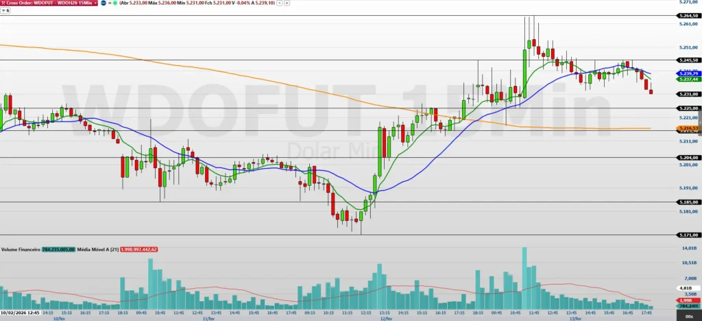 Por outro lado, a perda do suporte em 5.225/5.215,5 pontos reacende o fluxo vendedor. Caso esse nível seja rompido, o mercado pode acelerar em direção a 5.204/5.185 pontos, com um alvo mais longo em 5.171/5.153 pontos. A dinâmica segue estritamente técnica, dependendo do comportamento do preço nessas zonas.